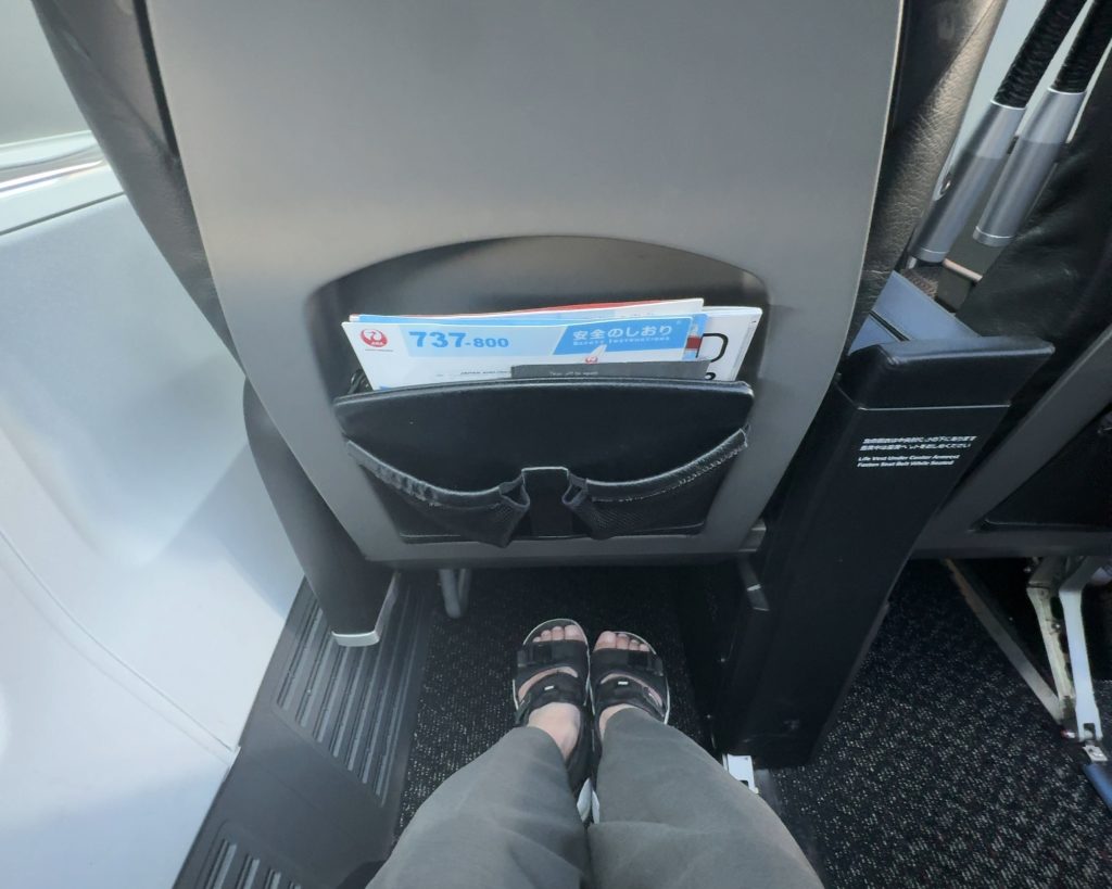広いピッチのシートで足元には余裕があり、フットレストも付いています。フライトの間は快適な睡眠を取れること間違い無いでしょう。膝から前の座席まで拳3個分くらいの余裕があり十分伸ばすことができます。