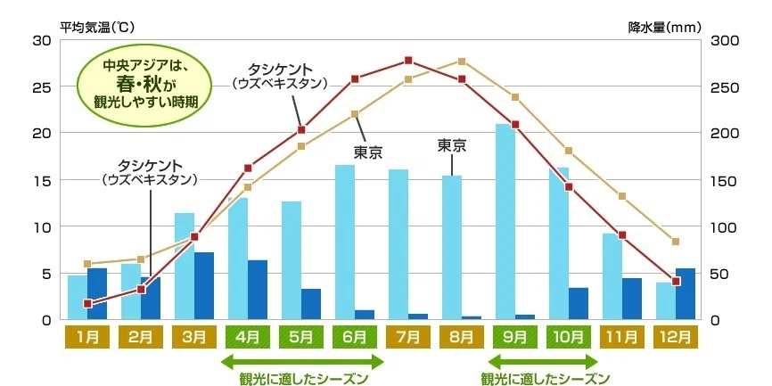 ウズベキスタンは年間を通じて乾燥しており、夏は暑く、冬は寒くなります。