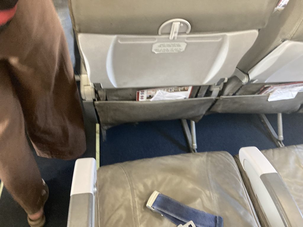 シートピッチはこのくらい。座ってみると拳1.5個分くらいで膝はきつかったですが、下にスペースが結構あったので、まあ3時間くらいなら耐えられるかなという感じ。