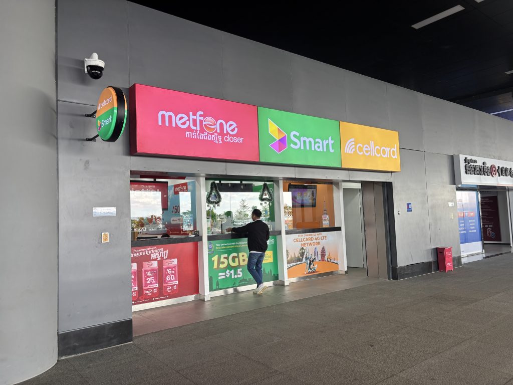 ゲートを出て右にまっすぐ行くとSIMカードの店舗があります。左から順にmetfone、smart、cellcardの3店舗です。