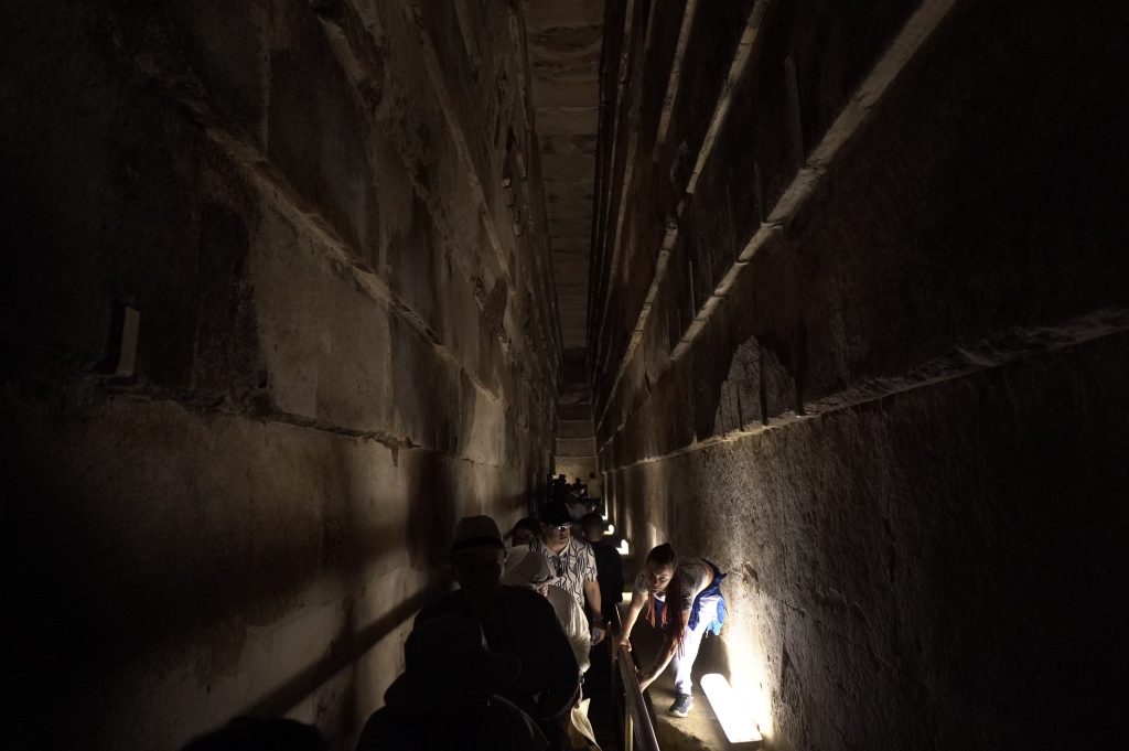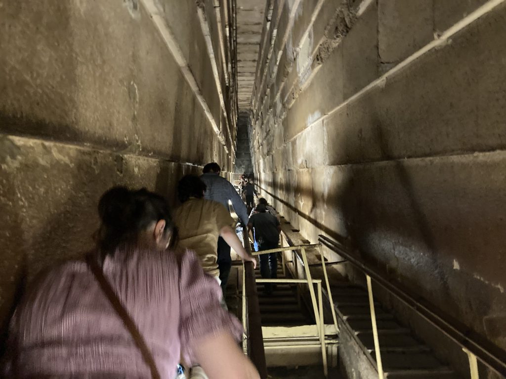 さていよいよピラミッドの内部に侵入します。入り口を進むと1.8mほどの高さの通路を進んでいきます。通路を5分ほど進むと上昇通路に到達します。この上昇通路がめちゃくちゃ辛いです。