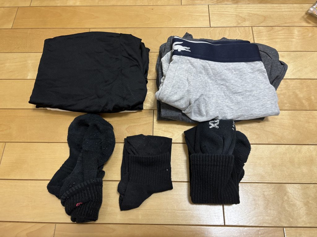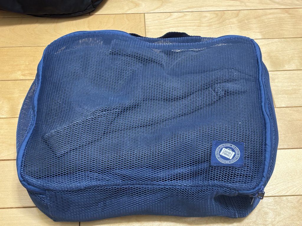 タイは年中常夏なので、透湿性が高い下着や洋服を持ち込みました。服装は半袖半ズボンで問題ありませんでした。洋服は適当に入れてしまうと嵩張る上に現地でどこに行ったかわからなくなってしまうので、写真右のようにネットに入れて持ち運びます。このネットは100均のものを利用しているのですが、チャックの部分がすぐに壊れてしまったので、無印のこちらをお勧めします。2、3枚購入しておくと便利ですよ。