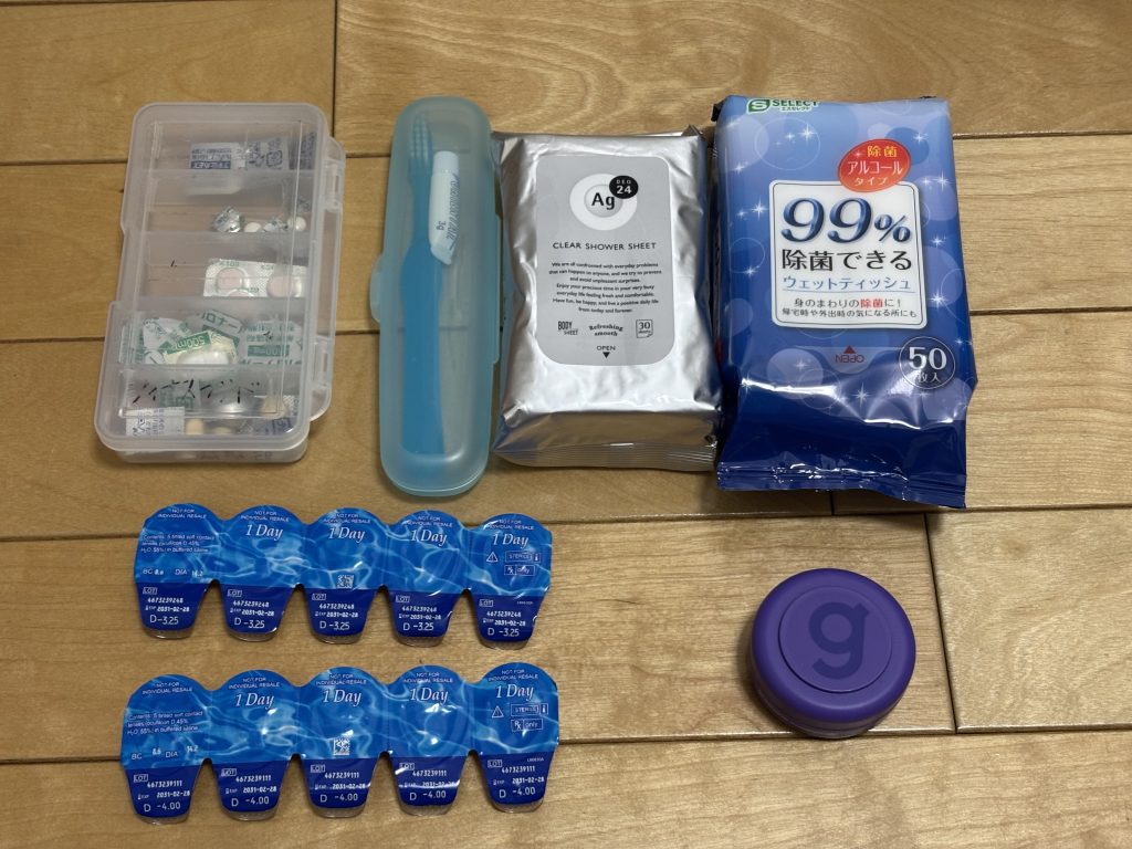 今回衛生、医療関連としてはこれらを持っていきました。特にあってよかったのがウエットティッシュと汗拭きシートです。