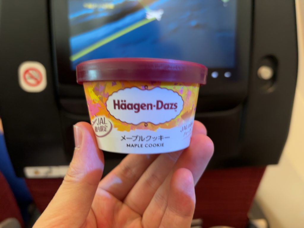 デザートには「ハーゲンダッツ メープルクッキー味」キンキンに冷えたアイスを雲の上で食べられて幸せです。クッキーのザクザク感もあり美味しかったです。